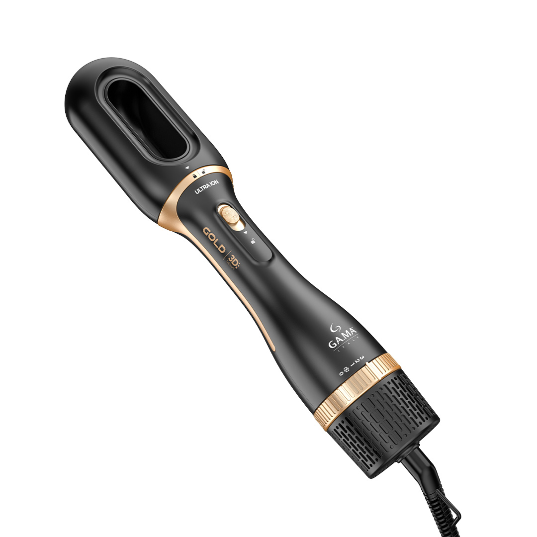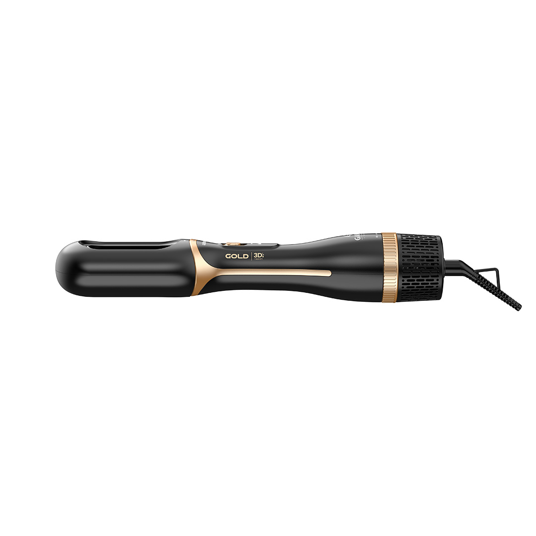 Cepillo Multi Styler Gold, un cepillo-secador que combina tecnología Ultra Ion, aceite de argán y recubrimiento cerámico para restaurar el cabello, reducir el frizz y aumentar brillo y flexibilidad. Explica los distintos cabezales incluidos (ovalado, secador y gota), diseñados para secar, dar volumen y modelar desde la raíz. Destaca sus cerdas mixtas y dobles para un mejor control y acabado, junto con un diseño ergonómico, selector de temperatura y punta fría. Incluye sus especificaciones técnicas como potencia de 1200 W, cable rotativo de 360°, tecnología 3D Therapy y 4 niveles de aire y temperatura.